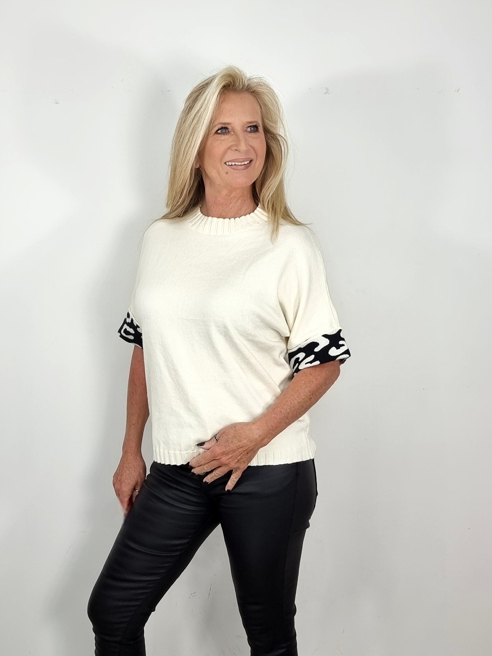 Dieser Pullover vereint schlichte Eleganz mit einem besonderen Detail! Das weiche Strickmaterial sorgt für ein angenehmes Tragegefühl, während die weiten Ärmel mit kontrastierendem Schwarz-Weiß-Muster dem Look das gewisse Etwas verleihen.