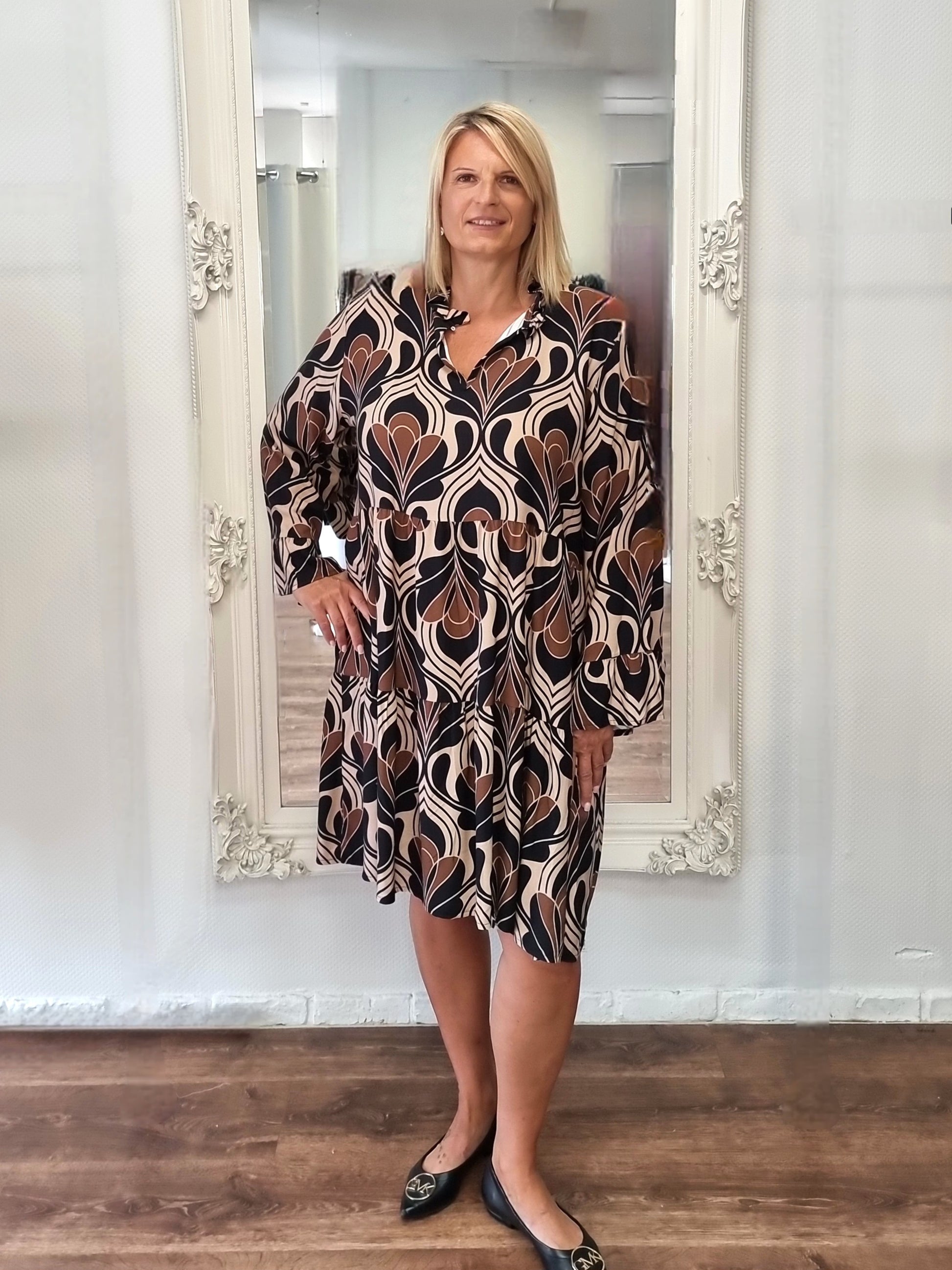 Luftig, bequem und stylisch! Das Kleid begeistert mit seinem auffälligen Allover-Muster in warmen Tönen und einem lockeren Schnitt, der die Figur umspielt.