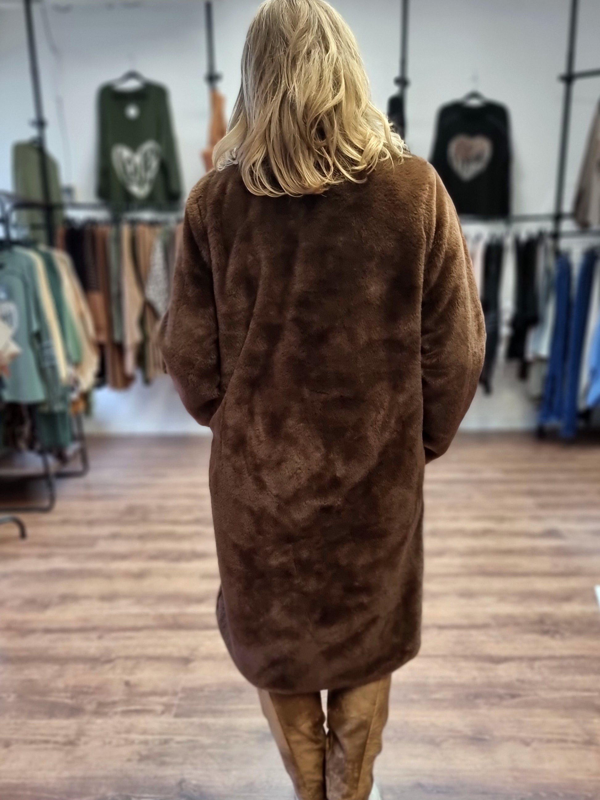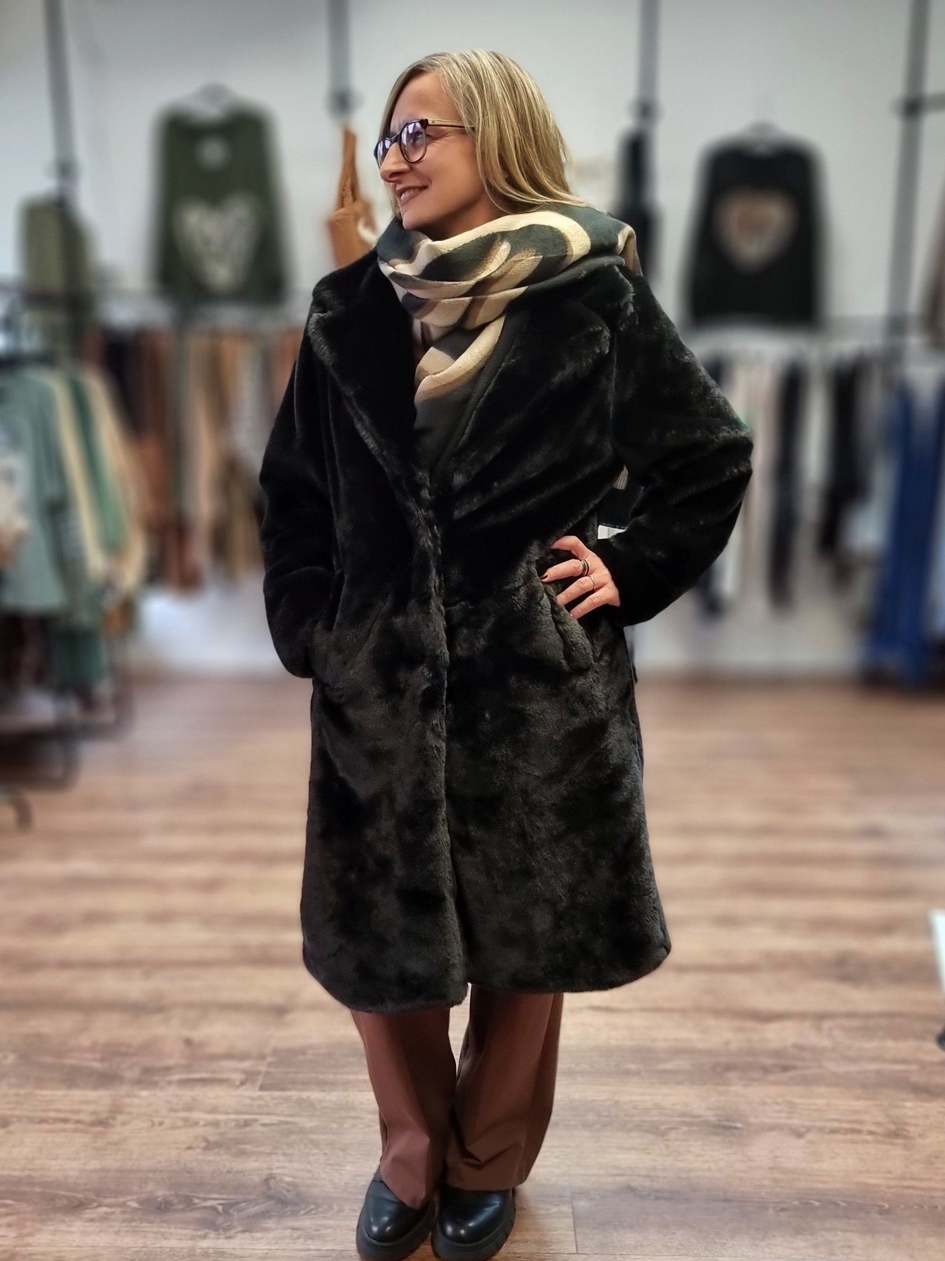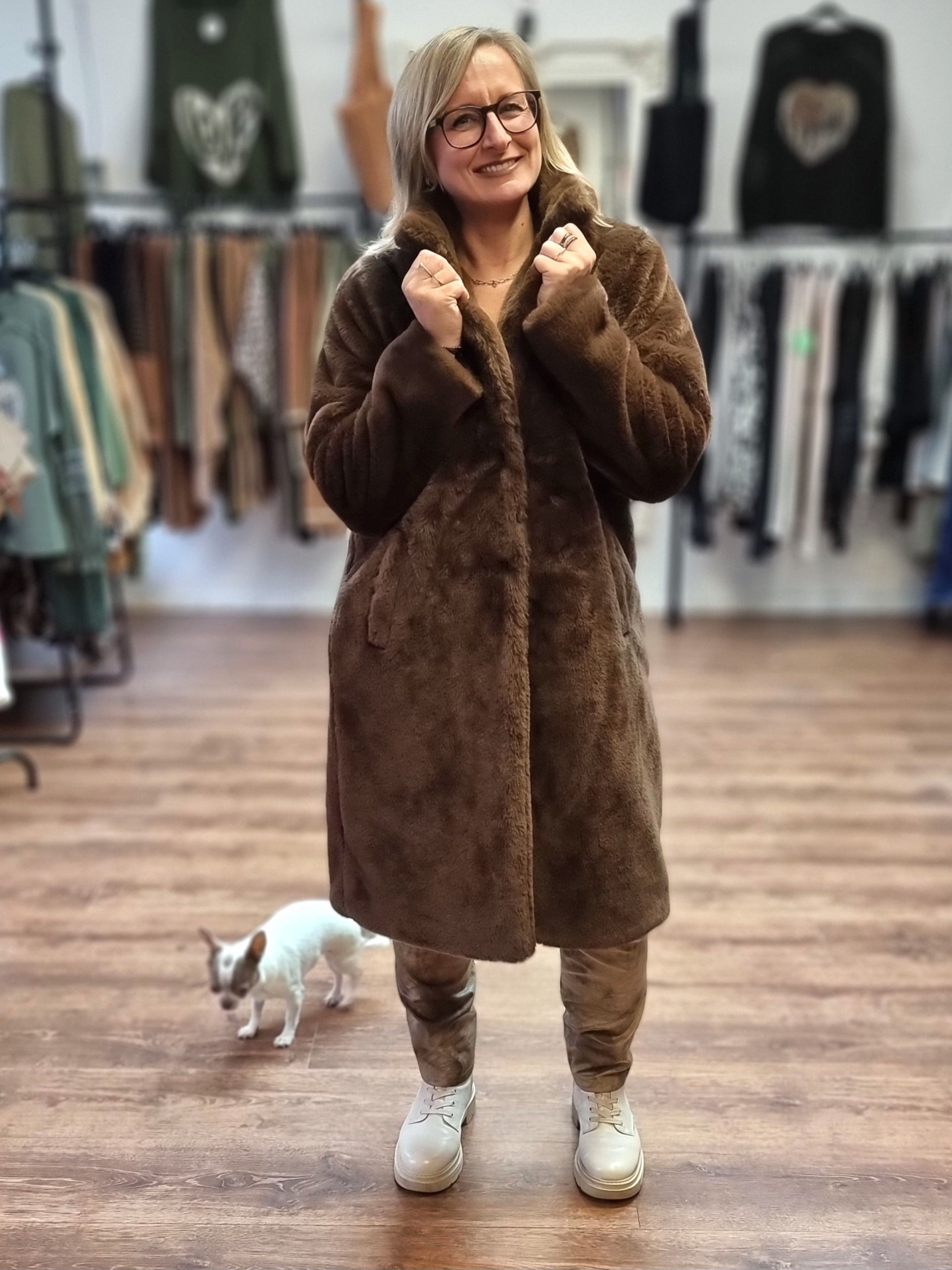 Dieser lange Fellmantel in warmem Schokobraun oder Schwarz ist ein echtes Highlight für die kühleren Tage! Die weiche, hochwertige Faux-Fur-Struktur sorgt nicht nur für ein unglaublich angenehmes Tragegefühl, sondern verleiht jedem Outfit sofort eine stilvolle, luxuriöse Note.