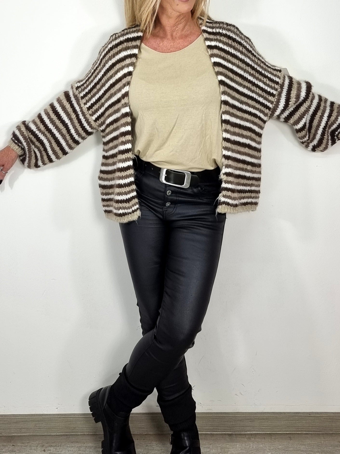 Diese wunderschöne Strickweste mit breiten Streifen in sanften Beige und Brauntönen ist ein echtes Wohlfühlteil! Der lockere, leicht verkürzte Schnitt und die weichen Maschen sorgen für höchsten Tragekomfort. Perfekt kombinierbar