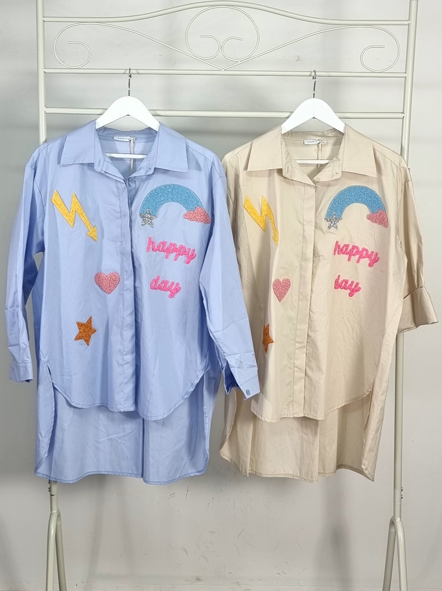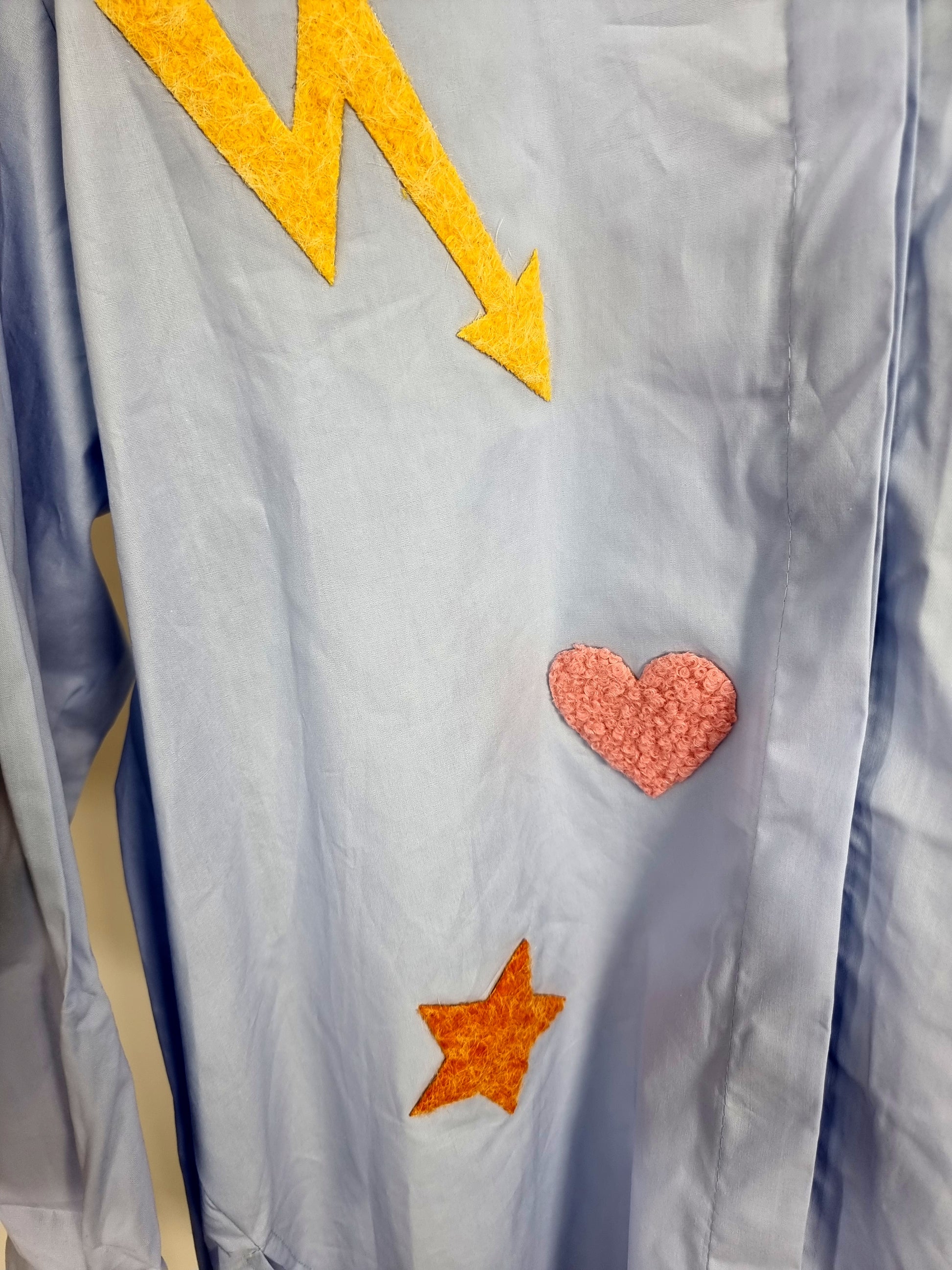 Diese besondere Bluse sorgt sofort für gute Laune! Die bunten Stickereien mit Regenbogen, Blitz, Herz und Stern machen sie zu einem echten Hingucker. Der lockere Schnitt und die längere Rückseite sorgen für einen modernen, lässigen Look und angenehmen Tragekomfort.