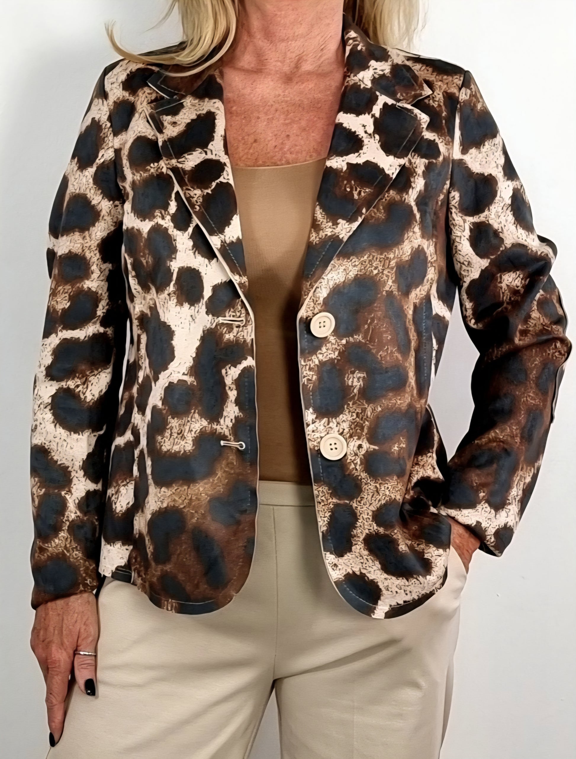 Setze ein modisches Statement mit diesem hochwertigen Blazer im ausdrucksstarken Leopardenprint. Der elegante Schnitt, das leichte Material und die warmen Naturtöne machen ihn zum perfekten Begleiter für jede Saison. Ob im Alltag
