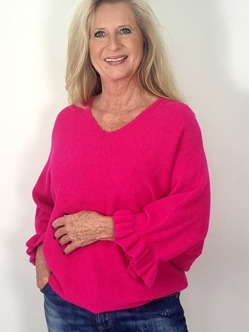 Dieser weiche Pullover ist ein echtes Wohlfühlteil! Die angesagten Fledermausärmel mit Rüschendetail und leichten V Ausschnitt machen ihn zu einem femininen Hingucker, während der lockere Schnitt jede Figur schmeichelt.