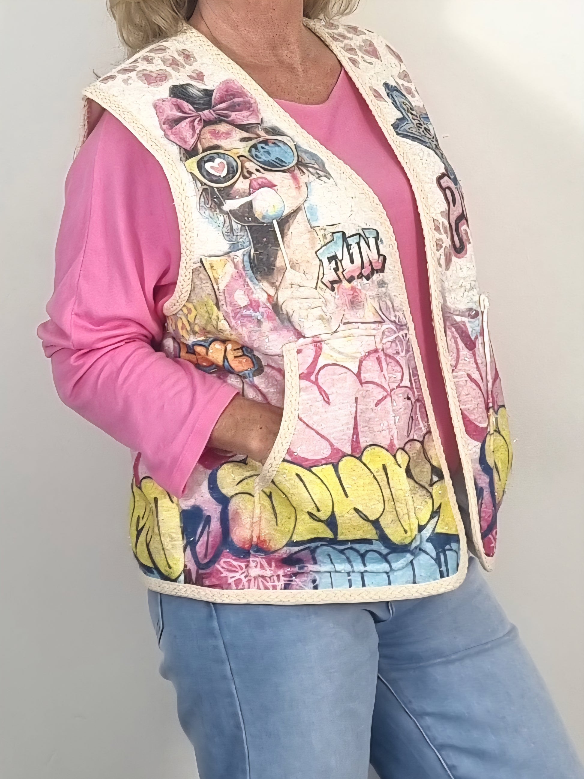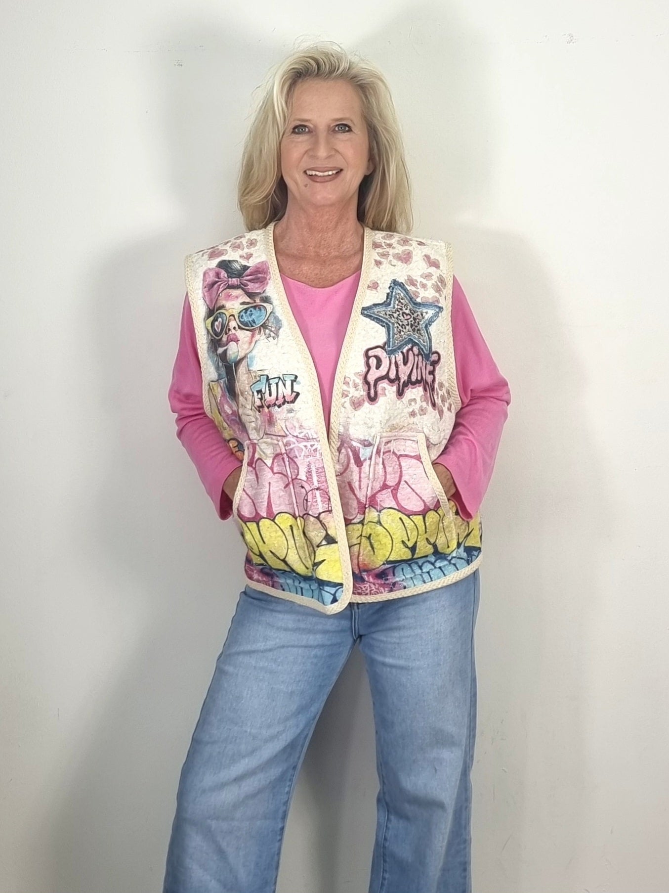Diese Weste bringt Farbe und Persönlichkeit in deinen Look. Der kreative Print mit stylischer Fashion-Figur, Stern-Details und modernen Graffiti-Elementen macht sie zu einem echten Hingucker.