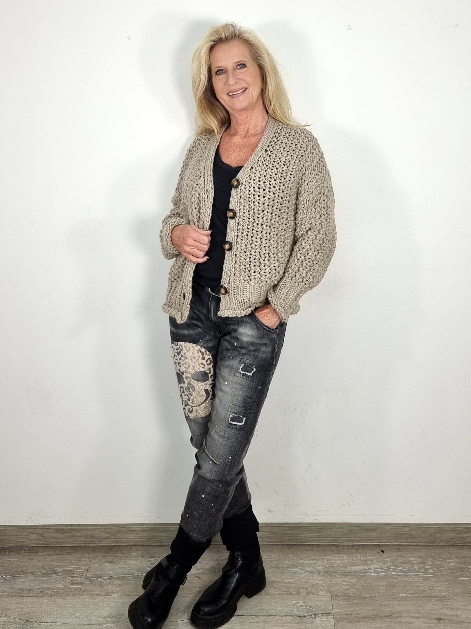Lässige Strickweste mit grober Struktur und Knopfverschluss. Der lockere Schnitt und die zeitlose Farbe machen sie zum perfekten Begleiter für Alltag und Übergangszeit. Angenehm zu tragen und vielseitig kombinierbar.